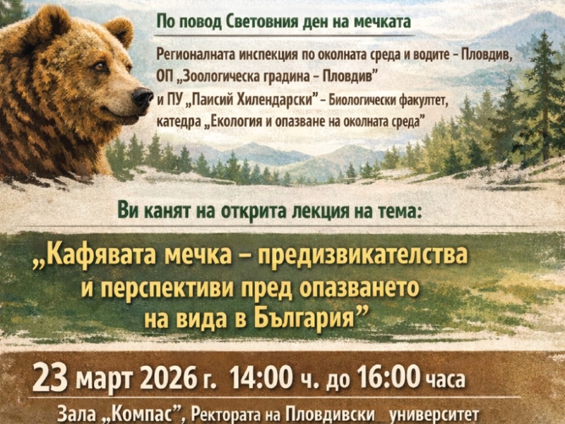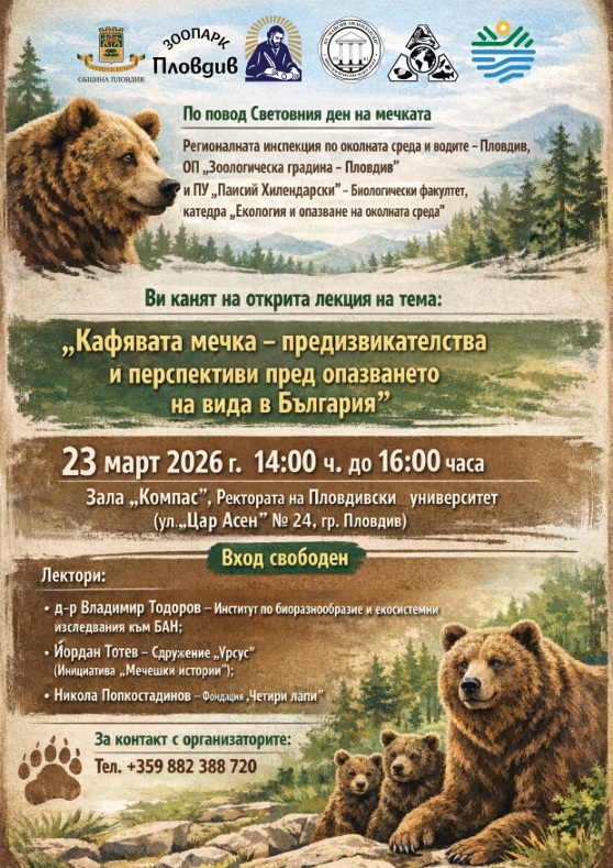 На 23 март 2026 г. – Световния ден на мечката – Регионална инспекция по околната среда и водите – Пловдив, Общинско предприятие „Зоологическа градина“ – Пловдив и Пловдивски университет „Паисий Хилендарски“, Биологически факултет, катедра „Екология и опазване на околната среда“ организират открита лекция на тема: „Кафявата мечка – предизвикателства и перспективи пред опазването на вида в България“.